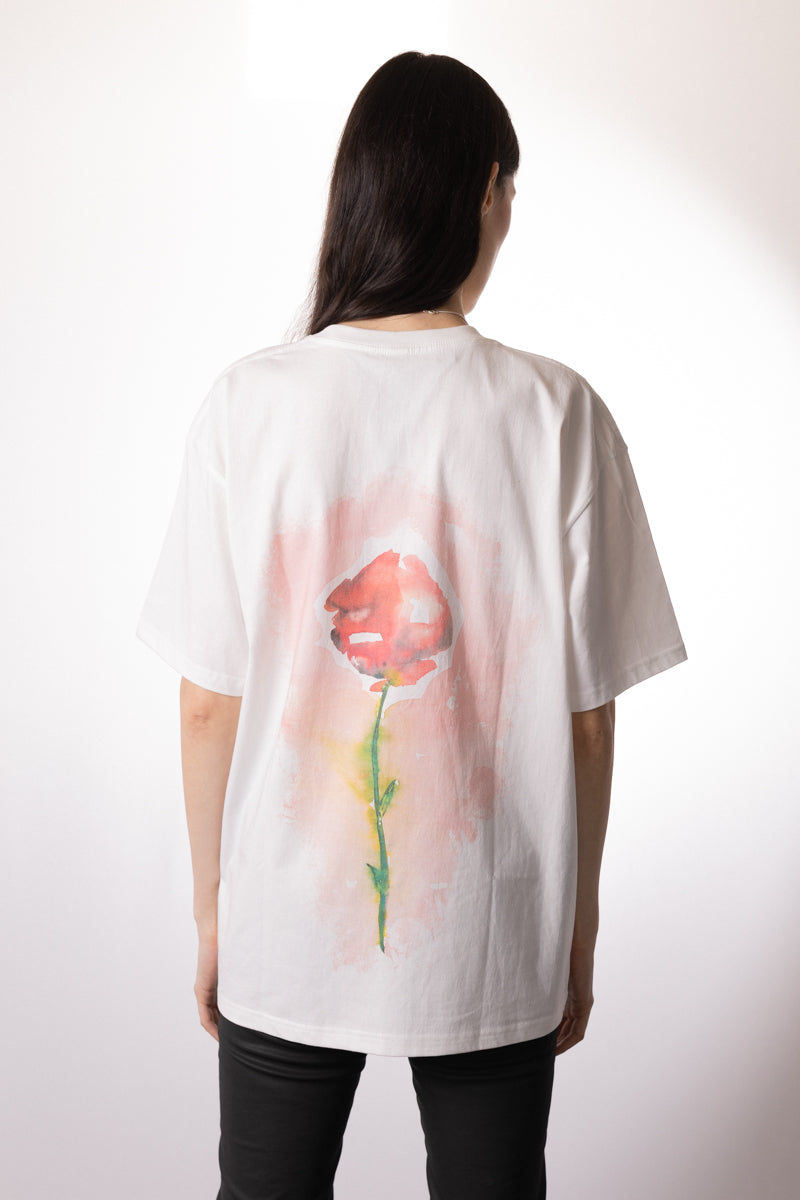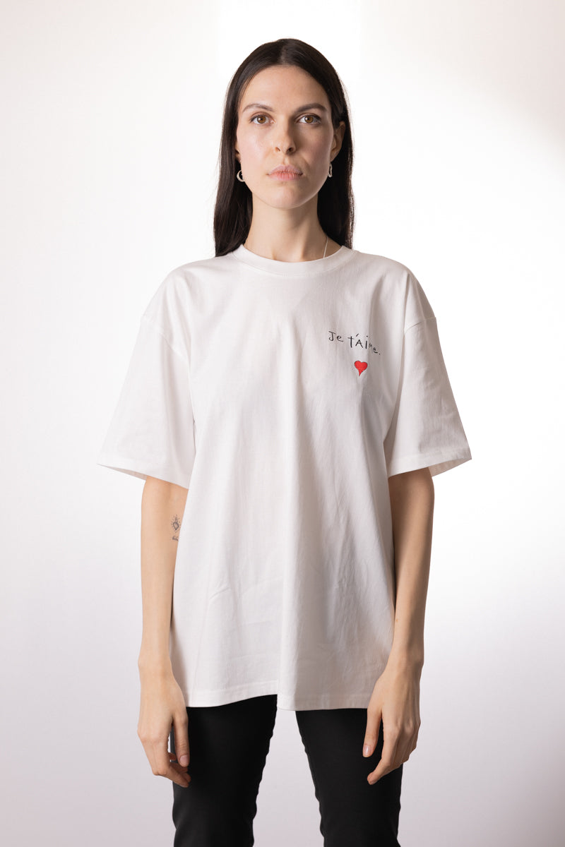 このジュ・テームTシャツには、背面に薔薇のプリント、前面に「Je T’Aime」(フランス語で「愛してる」の意)の文字が入っています。ジョニー・デップのアートワークにインスパイアされたこのデザインは、まるで美しい文字のような一輪のバラを通じて、秘めた愛情を繊細に表現しています。彼の娘のポートレートを反映したデザインです。