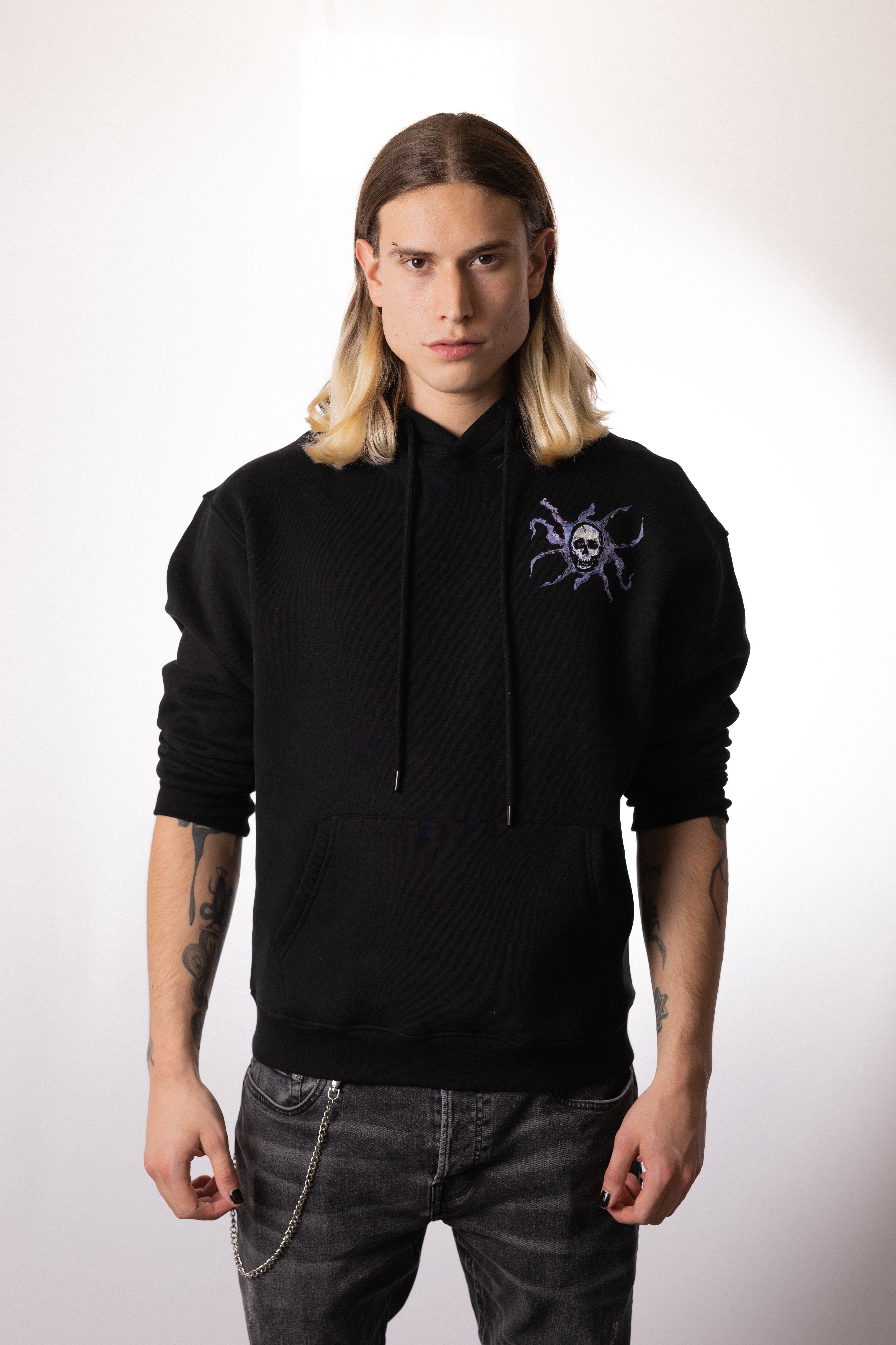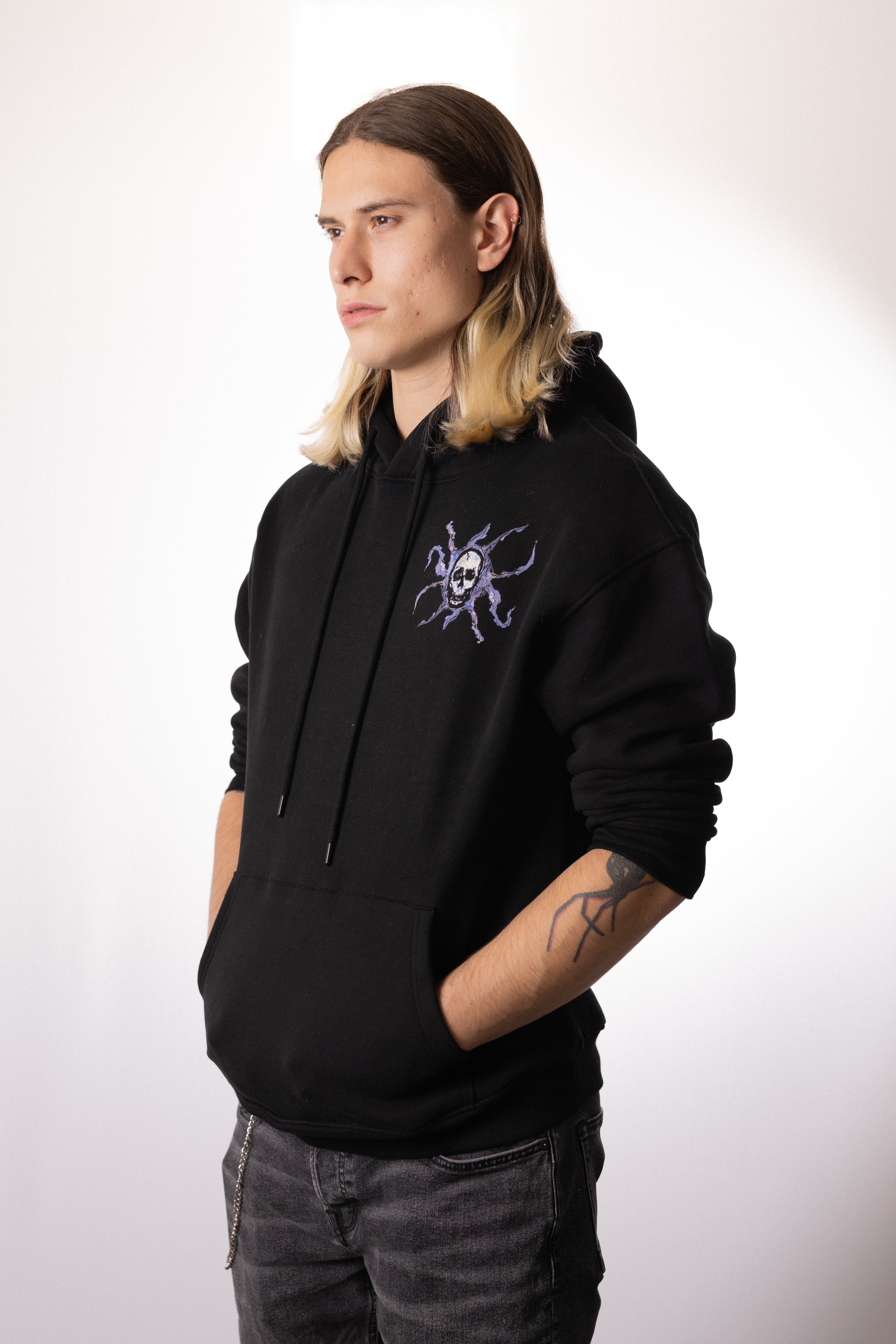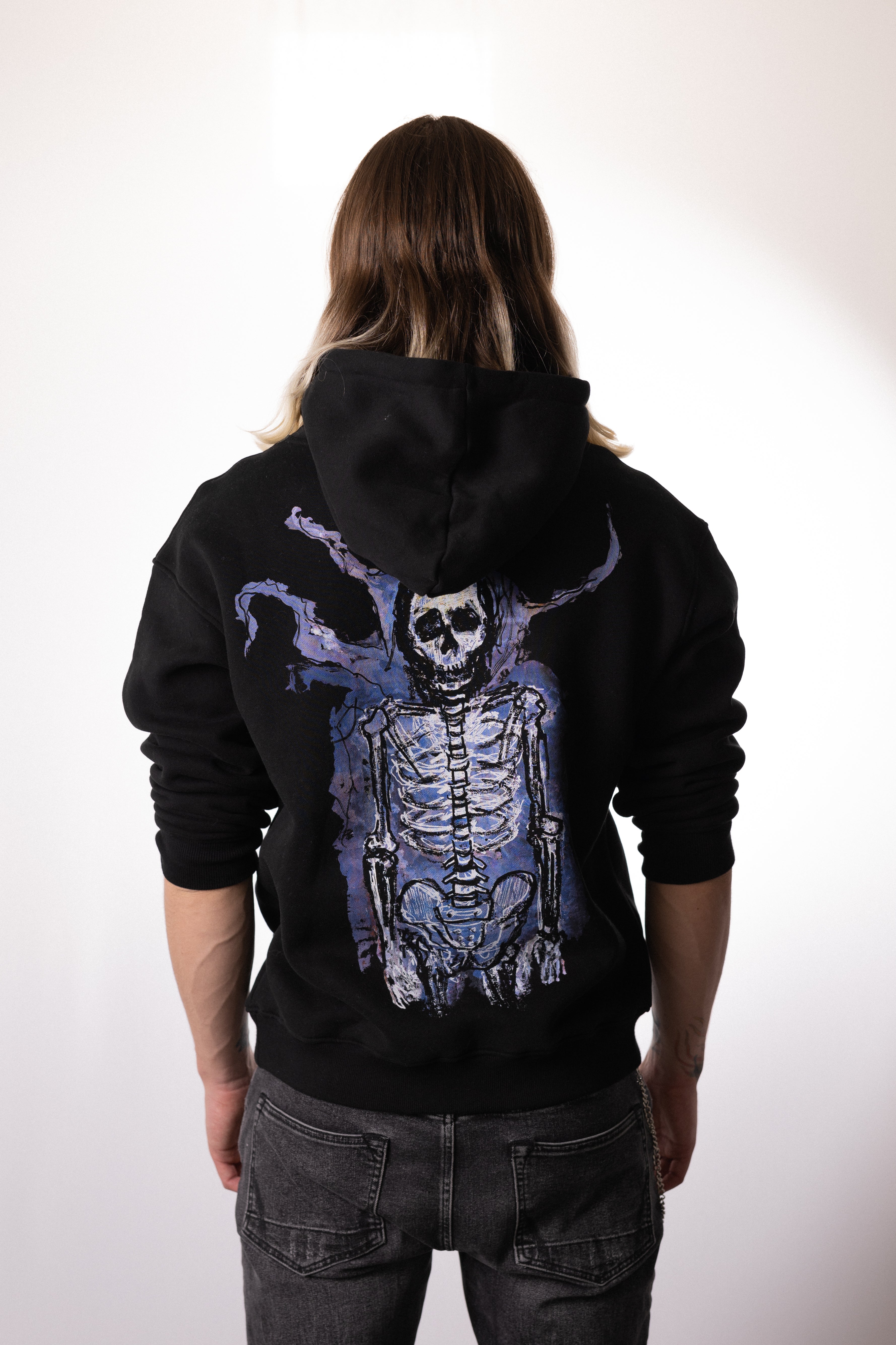 スケリー・ブラックフーディーは、背中にインパクトのある骸骨のプリントが施されています。ジョニー・デップの死と闇への傾倒がデザインに表れており、彼の家を飾る骸骨やスケルトンの数々を反映しています。